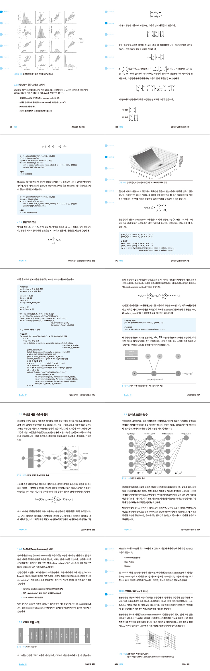 이러한 딥러닝 이론을 바탕으로, 책의 후반부에서는 실무에서 효과적으로 사용할 수 있는 딥러닝 모델을 소개함으로써 이론에만 치우치지 않고, 실무에도 도움이 되도록 내용을 구성했습니다.