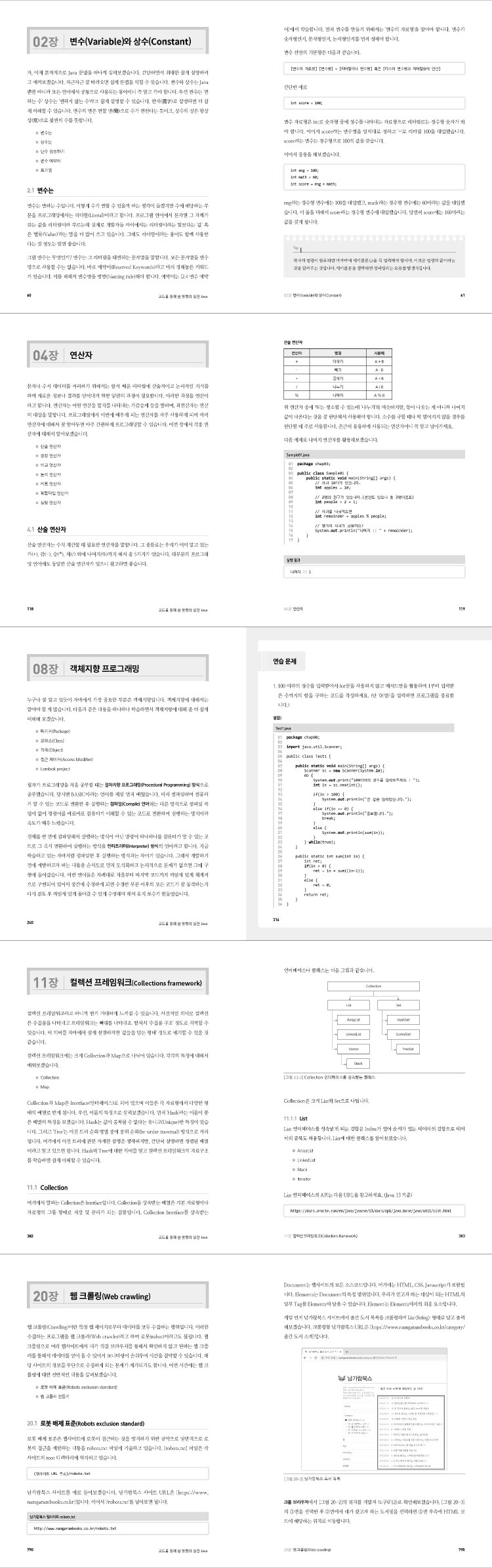이 책은 혼자서도 충분히 공부할 수 있게 예제를 많이 준비했습니다. 시중의 책들과 다른 점은 실무에 투입된 신입 개발자가 많이 다루지 않을 네트워킹과 스레드의 내용은 과감히 뺐다는 점입니다. 또한, Java만을 다루지 않고 실제로 많이 쓰이는 외부 라이브러리를 활용한 예제를 준비하여 실무에서 사용하는 기술들을 미리 학습하면서 지루하지 않고 재밌게 학습할 수 있게 준비했습니다. 한 챕터가 끝나면 연습 문제를 통해서 확실하게 익혔는지 확인한 후에 다음 챕터로 넘어가는 형태로 진행합니다.