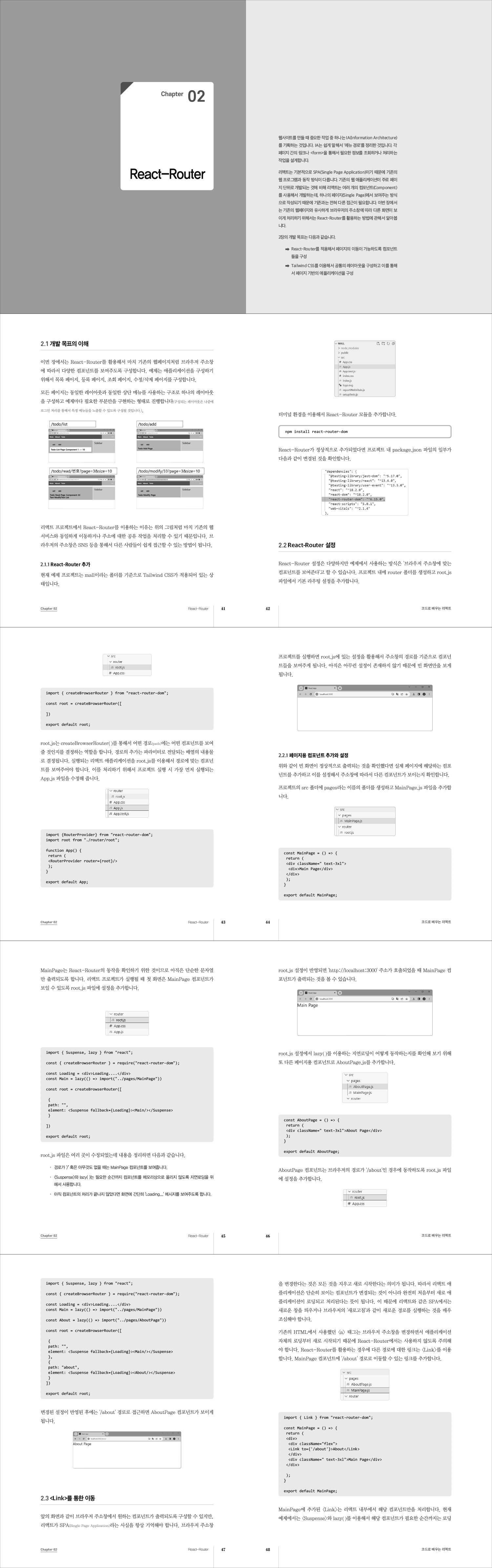 이 책은 리액트를 이용하면서 겪는 문제들의 방법론에 관한 이야기입니다. 과감하게 이론적인 설명은 줄이고 현실적으로 자주 사용하는 함수형 컴포넌트와 훅스를 이용하는 처리, Tailwind CSS를 사용하는 빠른 CSS 처리 등 최소한의 시간으로 확장 가능한 리액트 애플리케이션의 구조를 만드는 방식을 설명한 실습서입니다.